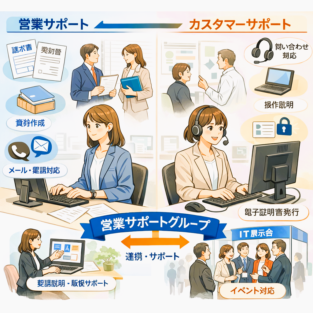 「営業サポート業務」と「カスタマーサポート業務」の両方を行っていただきます。その他、発生する社内プロジェクトの雑務等。 「営業サポート」:営業事務関連業務として、見積書、請求書などの作成、取引先への送付、契約書の作成(製本)、ファイリング、顧客情報の管理、問合せ対応(メール/電話)、既存ひな形の資料作成や修正、社内の申請業務、その他雑務(郵便物対応など)。 「カスタマー・サポート」:当社製品(電子書庫・電子契約等)に関する電話、HP等からの問い合わせに対する一次対応、新規・既存顧客に対する操作説明、不具合問合せへの対応(一般的な不具合については、マニュアルで対応。深刻なものについては、開発部と連携して対応)、その他、電子証明書(電子契約などで必要となる本人認証)の発行業務。したがって、営業サポートグループでは、単なる営業事務に留まらず、営業との連携を強め、営業マインドをもって、場合によってはWEBなどで当社製品の仕様説明も行い、製品の売り込みのサポートも行っていただく体制を目指し、そのサポートをお願いします。 |
